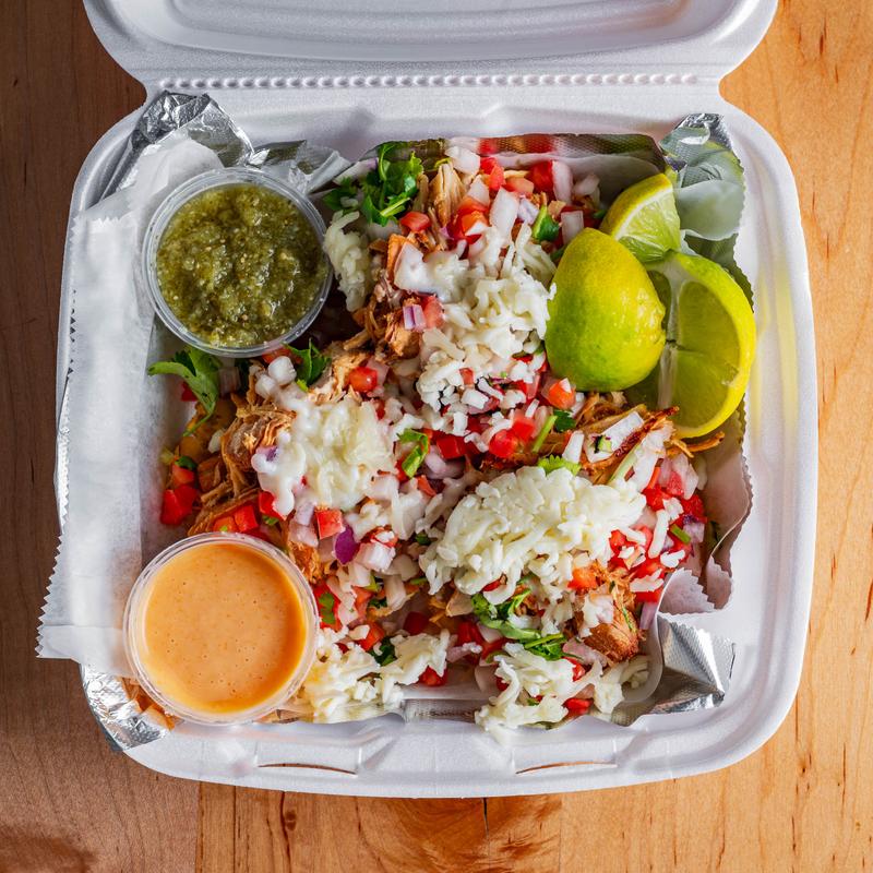 Three crispy plantain tostones (1/4" thick, fried crispy chips made of smashed green banana plantains), choice of protein, pico de gallo, mozzarella cheese, drizzled with aioli or bang-bang sauce.